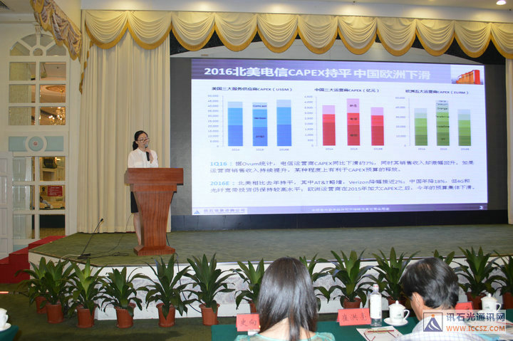緊接著,訊石分析師吳娜為大家?guī)砹恕度蚬馔ㄐ攀袌鼋鼪r & 100G市場分析》,為大家梳理了近期全球光通信市場的近況,也對(duì)100G市場的發(fā)展進(jìn)行了分析??傮w來說,2016年光器件和模塊的市場淡季不淡,100G系統(tǒng)部署基本被本國設(shè)備商瓜分掉,城域100G將成為發(fā)展亮點(diǎn)。