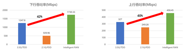 通過采用IntelligentRAN架構(gòu)下的智能多頻多站協(xié)同技術(shù),5G用戶在LTE2.1G、NR2.1G、NR3.5G小區(qū)間的切換、重選更加順暢,網(wǎng)絡(luò)性能和用戶體驗提升明顯。經(jīng)實測,空閑態(tài)用戶5G小區(qū)接入成功率提升至99.8%,同時,相比TDD單載波,下行速率提升42%,上行速率提升40%。
