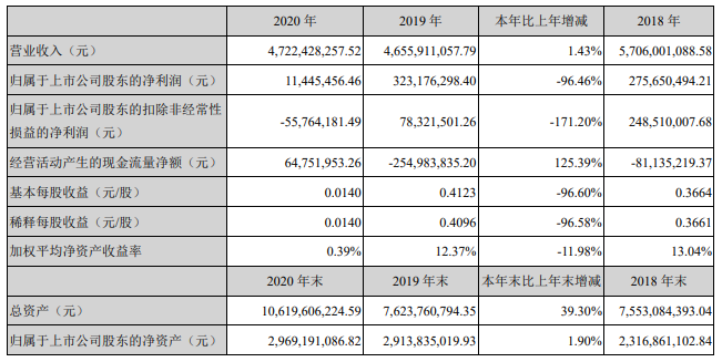 ICC訊(編輯:Anton)4月26日晚間,深圳市特發(fā)信息股份有限公司(簡(jiǎn)稱:特發(fā)信息)發(fā)布2020年度報(bào)告,報(bào)告期內(nèi),公司實(shí)現(xiàn)營(yíng)業(yè)收入47.22億元,同比增長(zhǎng)1.43%。歸屬于上市公司股東凈利潤(rùn)1144.55萬(wàn),同比下降96.46%。2020年末總資產(chǎn)106.20億,同比增長(zhǎng)39.30%。利潤(rùn)同比變動(dòng)的主要原因是由于去年同期確認(rèn)泰科大廈資產(chǎn)處置收益2.1億元所致。