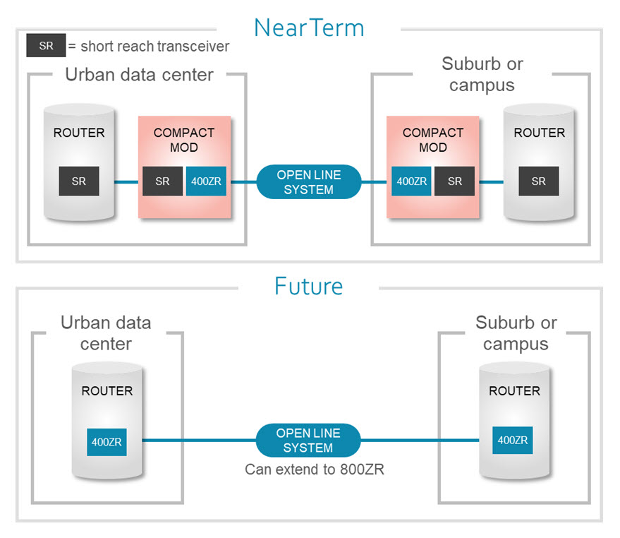 在這種新架構(gòu)中,可以通過(guò)將400ZR可插拔收發(fā)器插入每個(gè)路由器并通過(guò)“開(kāi)放線路系統(tǒng)”DWDM波長(zhǎng)波分復(fù)用器連接光纖來(lái)建立連接,而不是使用專(zhuān)有接口的多個(gè)連接。300km甚至更遠(yuǎn)距離也可以適用400ZR+模塊。