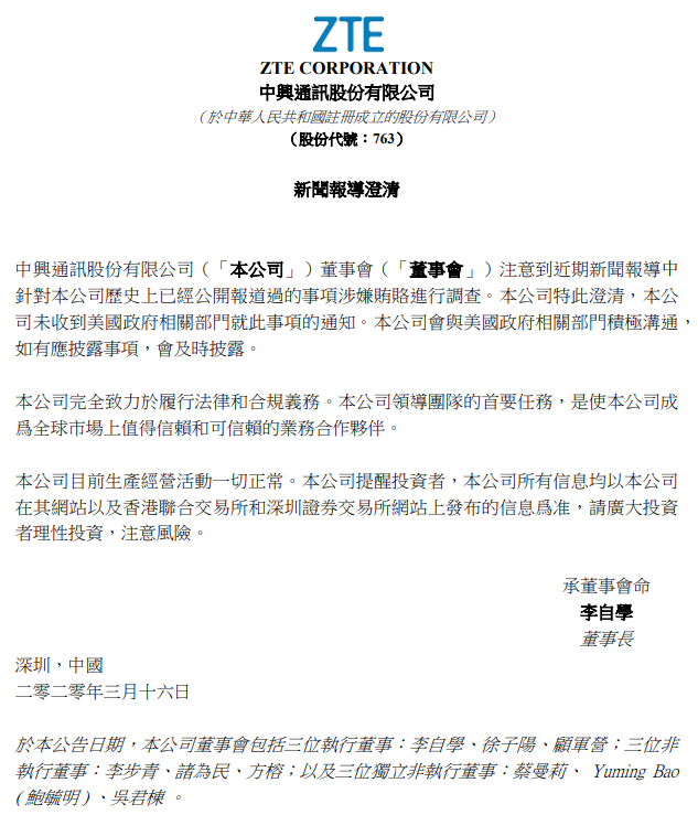中興通訊股份有限公司(「本公司」)董事會(「董事會」)注意到近期新聞報導(dǎo)中針對本公司歷史上已經(jīng)公開報道過的事項(xiàng)涉嫌賄賂進(jìn)行調(diào)查。本公司特此澄清,本公司未收到美國政府相關(guān)部門就此事項(xiàng)的通知。本公司會與美國政府相關(guān)部門積極溝通,如有應(yīng)披露事項(xiàng),會及時披露。