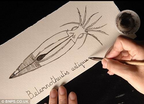 一位古生物學家鑿開一塊看似普通的巖石,他們發(fā)現(xiàn)其中的烏賊化石標本中帶有1英寸長的黑色墨囊。當這個史前墨囊被打開,其中的一些較小鈣化物質(zhì)樣本被移除,放置在氨水溶液中能夠成為墨汁。負責此項挖掘工作的菲爾-威爾比(Phil Wilby)博士稱,這個烏賊墨囊石化的過程源自“梅杜薩效應”(Medusa effect),該效應能將動物標本非??斓厥?。這可能是迄今世界上保存最完好的化石標本。