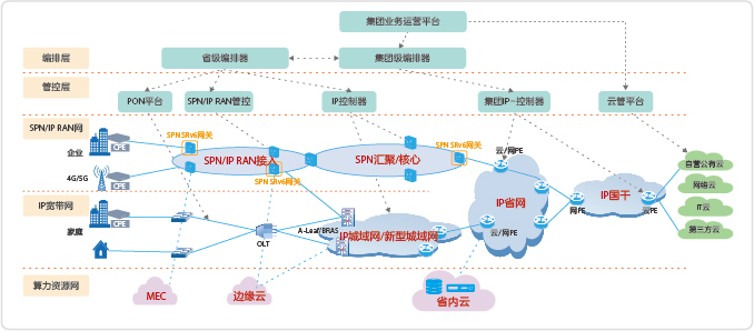 在算力網(wǎng)絡(luò)體系中,面向政企客戶的專線業(yè)務(wù),是實(shí)現(xiàn)云網(wǎng)融合的基礎(chǔ)條件,占據(jù)重要的地位。IP云專線業(yè)務(wù)是運(yùn)營(yíng)商收入的重要來(lái)源,為政企客戶、中小型企業(yè)、商業(yè)樓宇等提供算力資源池接入服務(wù)。算力資源網(wǎng)(見(jiàn)圖1)包括靠近用戶的邊緣MEC、城域內(nèi)邊緣云、省級(jí)建設(shè)的省內(nèi)云,以及屬于運(yùn)營(yíng)商集團(tuán)層面的公有云、網(wǎng)絡(luò)云、IT云和其他互聯(lián)網(wǎng)企業(yè)提供的第三方云。