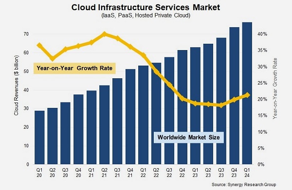 ICC訊(編譯:Nina)Synergy Research Group的最新數(shù)據(jù)顯示,2024年第一季度,全球企業(yè)在云基礎(chǔ)設(shè)施服務(wù)上的支出遠(yuǎn)遠(yuǎn)超過(guò)760億美元,比2023年第一季度增長(zhǎng)了135億美元,即21%。這是該市場(chǎng)連續(xù)第二個(gè)季度同比增速明顯改善,且2024年第一季度是自2022年第三季度以來(lái)增長(zhǎng)最強(qiáng)勁的季度。盡管程度有所減輕,但仍存在一些經(jīng)濟(jì)、貨幣和政治阻力。然而,市場(chǎng)的潛在力量不僅彌補(bǔ)了這些限制,而且在很大程度上得益于生成式人工智能技術(shù)和服務(wù)的影響。