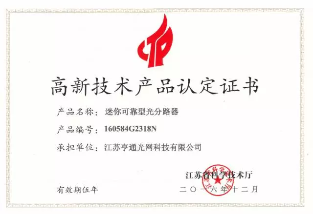 ICCSZ訊 近日,亨通通信產業(yè)集團江蘇亨通光網科技有限公司(以下簡稱:亨通光網)“迷你可靠型光分路器”獲江蘇省科學技術廳頒發(fā)的高新技術產品認定證書。