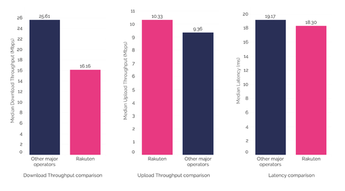 Tutela looked at the upload, download and latency speeds for Rakuten and its rivals Docomo, SoftBank and KDDI's au. Click here for a larger version of this image.