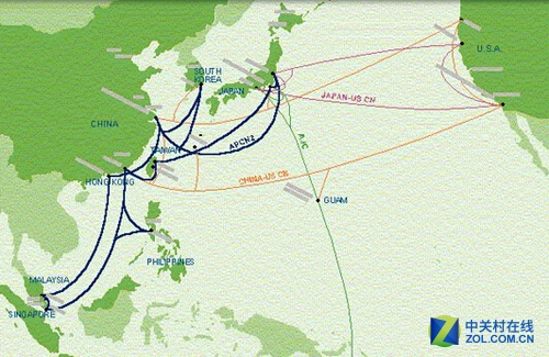 中美海底光纜(China-US CN or CUCN),主要連接亞洲和北美洲,全長(zhǎng)30.8萬(wàn)公里,采用4對(duì)纖芯,每對(duì)8*2.488Gbps SDH over DWDM光纖技術(shù),光纖容量為80Gbps,其中大陸地區(qū)的登陸站為上海和汕頭。