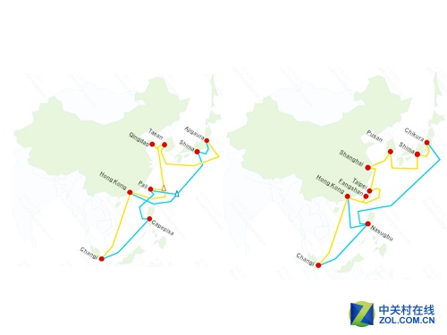 東亞海底光纜系統(tǒng)(左)和城市到城市海底光纜(右)