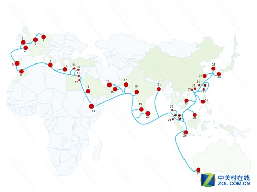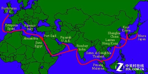 亞歐海底光纜(South-East Asia - Middle East - Western Europe 3,即SEA-ME-WE 3),是目前世界上耗資最大、長(zhǎng)度最長(zhǎng)(3.9萬(wàn)公里)、途經(jīng)國(guó)家和地區(qū)最多的海底光纜,采用2對(duì)纖芯,每對(duì)48*10 Gbps DWDM光纖技術(shù),光纖容量為960Gbps,其中大陸地區(qū)的登陸站為上海和汕頭。