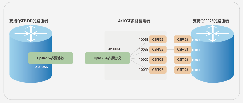 線路側(cè)光模塊采用與客戶側(cè)相同的封裝對網(wǎng)絡(luò)運營商來說是有益的,這樣通過更簡單的網(wǎng)絡(luò)架構(gòu)來降低成本。結(jié)合近來開放線路系統(tǒng)(Open Line System, OLS)的行業(yè)趨勢,這些傳輸光模塊可以直接插入路由器使用而無需外部傳輸系統(tǒng)。這樣可以簡化控制平臺,同時降低成本、功耗和占地面積。例如圖3所示的網(wǎng)絡(luò)應(yīng)用場景,用戶可以選擇直接將滿足OpenZR+的相干光模塊插到支持OLS的路由器的端口上,也可以將其插到用來實現(xiàn)信號協(xié)議轉(zhuǎn)換的傳輸設(shè)備的線路側(cè)端口上,再通過該設(shè)備的客戶側(cè)端口與路由器連接。