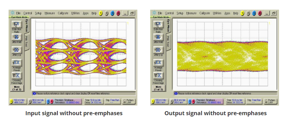 如果沒有預(yù)加重,一個(gè)完美的信號(hào)經(jīng)過傳輸線后,惡化的眼圖已經(jīng)沒辦法睜開。有預(yù)加重后的信號(hào),在經(jīng)過傳輸線后,信號(hào)依舊比較完美。