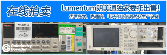 高富拍賣受Lumentum朗美通獨(dú)家委托,出售一批優(yōu)質(zhì)光學(xué)、光通信、電子及電信測(cè)試設(shè)備。包括包括YOKOGAWA光譜分析儀、Agilent '86100C'寬帶示波器、Agilent '8164B'光波測(cè)量系統(tǒng)、Picosecond'12070'可編程模式發(fā)生器、Tektronix矢量信號(hào)發(fā)生器,Newport耦合測(cè)試機(jī)柜,東莞捷特冷熱沖擊試驗(yàn)箱,Keithley'2400'數(shù)字源表,Keithley'2502'雙通道皮安表, Keithley'2510'TEC數(shù)字源表及Keithley溫控源表等眾多品類。