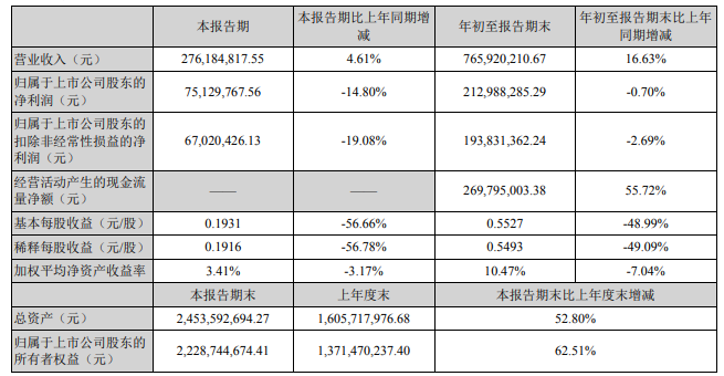 ICC訊 (編輯:Nicole) 蘇州天孚光通信股份有限公司(以下簡稱“天孚通信”或“公司”)發(fā)布2021 年第三季度報告:報告期內(nèi),公司實現(xiàn)營收2.76億元,同比增長4.61%;歸屬于上市公司股東的凈利潤7512.98萬元,同比下降14.80%。