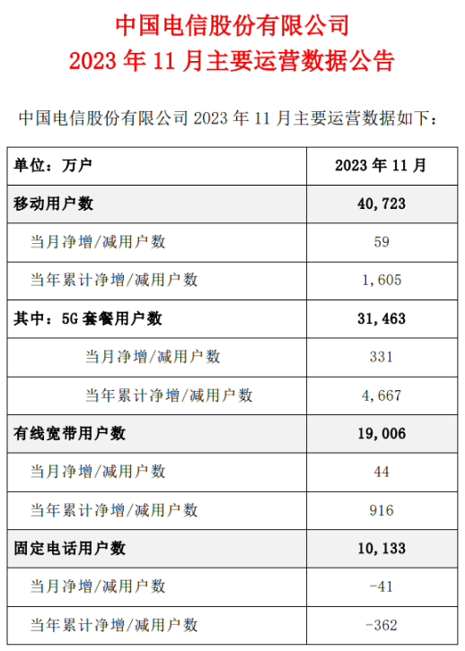 ICC訊 中國(guó)電信公布了2023年11月主要運(yùn)營(yíng)數(shù)據(jù)。當(dāng)月,移動(dòng)用戶數(shù)累計(jì)4.0723億戶。其中5G套餐用戶數(shù)累計(jì)3.1463億戶。中國(guó)電信移動(dòng)用戶數(shù)凈增59萬戶,其中5G套餐用戶數(shù)凈增331萬戶。
