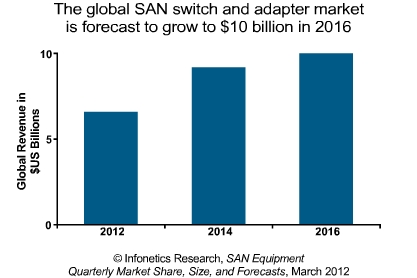 SAN適配器方面,Qlogic和Emulex占據(jù)大部分份額。2011年這兩家公司銷售收入再次實現(xiàn)健康增長,不過同時他們的對手也在穩(wěn)步向前發(fā)展。