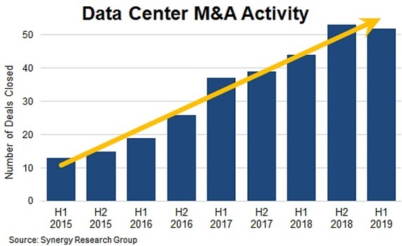 ICCSZ訊(編譯:Nina)Synergy Research的新數據顯示,2019年上半年,數據中心市場并購繼續(xù)保持過去四年的強勁增長趨勢,52起相關并購交易已經結束,比2018年上半年增長18%,且超過了2016年全年的總交易量。