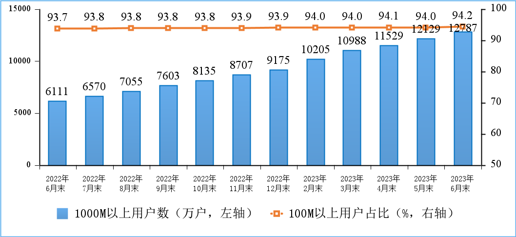 固定寬帶接入用戶數(shù)穩(wěn)步增加,千兆用戶占比超兩成。截至6月末,三家基礎(chǔ)電信企業(yè)的固定互聯(lián)網(wǎng)寬帶接入用戶總數(shù)達6.14億戶,比上年末凈增2468萬戶。其中,100Mbps及以上接入速率的固定互聯(lián)網(wǎng)寬帶接入用戶達5.79億戶,占總用戶數(shù)的94.2%,占比較上年末提升0.3個百分點;1000Mbps及以上接入速率的固定互聯(lián)網(wǎng)寬帶接入用戶達1.28億戶,比上年末凈增3612萬戶,占總用戶數(shù)的20.8%。