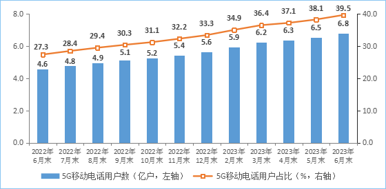 移動電話用戶穩(wěn)中有增,5G用戶規(guī)模加速擴大。截至6月末,三家基礎(chǔ)電信企業(yè)的移動電話用戶總數(shù)達17.1億戶,比上年末凈增2653萬戶。其中,5G移動電話用戶達6.76億戶,比上年末凈增1.15億戶,占移動電話用戶的39.5%,占比較上年末提高6.2個百分點。