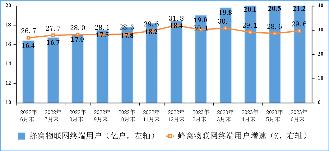 蜂窩物聯(lián)網(wǎng)用戶較快增長,IPTV用戶穩(wěn)步增加。截至6月末,三家基礎(chǔ)電信企業(yè)發(fā)展蜂窩物聯(lián)網(wǎng)終端用戶21.2億戶,比上年末凈增2.79億戶,占移動網(wǎng)終端連接數(shù)(包括移動電話用戶和蜂窩物聯(lián)網(wǎng)終端用戶)的比重達55.4%。IPTV(網(wǎng)絡(luò)電視)總用戶數(shù)達3.92億戶,比上年末凈增1148萬戶。