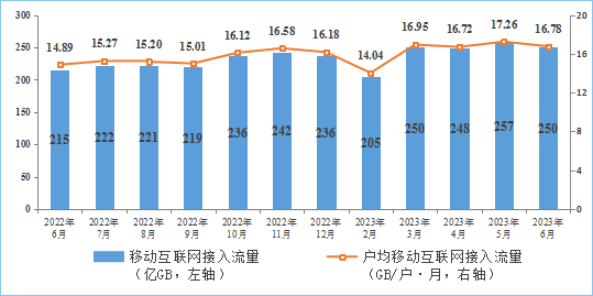 移動互聯(lián)網(wǎng)流量增速持續(xù)提升,6月DOU值保持較高水平。上半年,移動互聯(lián)網(wǎng)累計流量達1423億GB,同比增長14.6%,增速較一季度回升0.9個百分點。截至6月末,移動互聯(lián)網(wǎng)用戶數(shù)達14.9億戶,比上年末凈增3825萬戶。6月當月戶均移動互聯(lián)網(wǎng)接入流量(DOU)達到16.78GB/戶·月,同比增長12.8%,較上年12月份高0.6GB/戶·月。