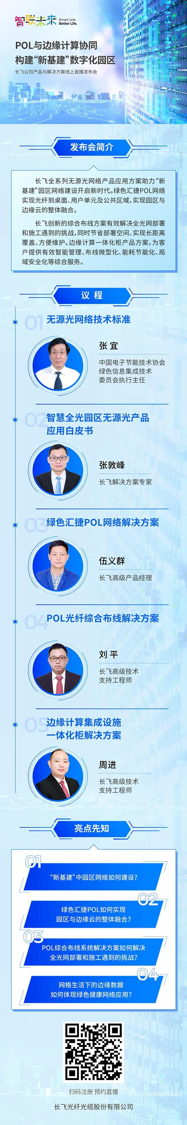 ICC訊 6月28日,長(zhǎng)飛光纖光纜股份有限公司(以下簡(jiǎn)稱(chēng)“長(zhǎng)飛公司”,股票代碼:601869.SH、06869.HK)推出“智聯(lián)未來(lái)”產(chǎn)品與解決方案線(xiàn)上直播系列發(fā)布會(huì)首場(chǎng),反響熱烈。7月10日,長(zhǎng)飛公司將推出第二場(chǎng)線(xiàn)上直播發(fā)布會(huì)——“POL與邊緣計(jì)算協(xié)同,構(gòu)建‘新基建’數(shù)字化園區(qū)”,聚焦智慧全光園區(qū)無(wú)源光產(chǎn)品應(yīng)用、綠色匯捷POL網(wǎng)絡(luò)解決方案、POL網(wǎng)絡(luò)和光纖綜合布線(xiàn)、邊緣計(jì)算集成設(shè)施一體柜等解決方案,展現(xiàn)長(zhǎng)飛公司在“新基建”大潮中助力開(kāi)啟園區(qū)萬(wàn)物互聯(lián)的綜合服務(wù)能力。