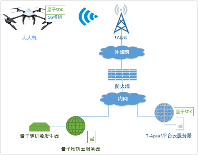 該方案以”平臺(tái)+網(wǎng)+X”為抓手,匯集量子密鑰分發(fā)技術(shù)、5G網(wǎng)絡(luò)切片技術(shù)、eSIM技術(shù)、無(wú)人機(jī)等技術(shù)優(yōu)勢(shì),將5G與量子加密技術(shù)融合,打造出國(guó)內(nèi)首款5G+量子通信模組。通過(guò)封裝技術(shù)將量子加密SDK功能嵌入中國(guó)聯(lián)通T-APaaS平臺(tái)中,形成端到端一站式安全傳輸解決方案。