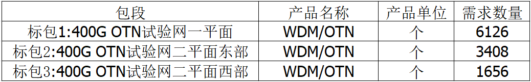 據(jù)悉,本次招標(biāo)為預(yù)估規(guī)模,實(shí)際采購(gòu)量以采購(gòu)合同為準(zhǔn)(注:預(yù)計(jì)本次采購(gòu)需求滿足期為一年。)項(xiàng)目劃分3個(gè)標(biāo)本,據(jù)了解,項(xiàng)目預(yù)估采購(gòu)規(guī)模為新增OTN設(shè)備1910臺(tái)、400G線路OTU端口11190個(gè)。需求數(shù)量如下:
