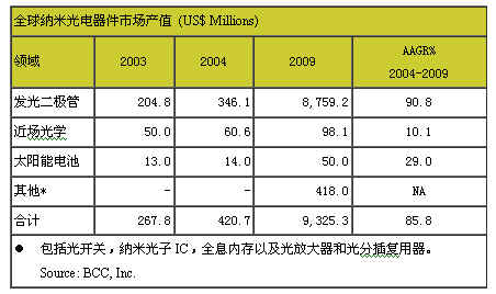 據(jù)市場研究公司BCC于日前公布的最新市調(diào)報告稱,全球納米光電器件(Nanophotonic Devices)市場產(chǎn)值,將由2004年4.2億美元,一路增長到2009年的93.3億美元,預(yù)計2004-2009年間的年增長率將達(dá)到85.8%。 納米光電器件與納米光電學(xué) (nano-optoelectronics)關(guān)系密切,這里所涉及的市場研究同時亦涵蓋納米應(yīng)用于光子器件(photonic device) 和光電器件(optoelectronic device)。 納米光電發(fā)光二極管(Nanophotonic light-emitting diodes),由于受到監(jiān)視器及顯示器市場的激勵,增長快速,其中應(yīng)用最廣泛的領(lǐng)域:平面顯示器面板和等離子面板,在2004年這兩類即占有總體納米光電器件市場的82%份額率,并且在2004-2009年間以90%年增長率增長。另外,近場光學(xué)(Near-field optics)和色素增感太陽能電池(Nanocrystalline Dye sensitized Solar cell),分別占總體的14.4%和3.3%市占率。