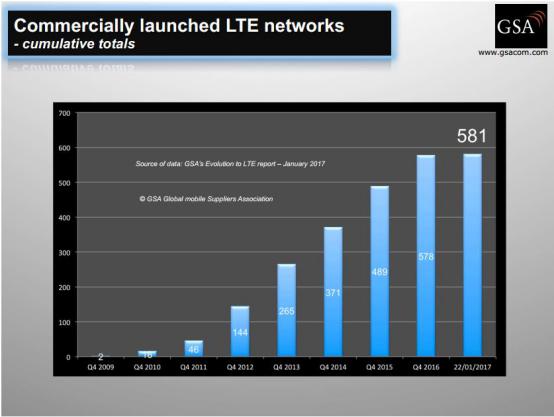 ICCSZ訊 過去一年中,LTE在全球高速擴(kuò)張。來自GSA的最新報(bào)告顯示,截至2017年1月末,全球運(yùn)營(yíng)商已經(jīng)簽署764張LTE網(wǎng)絡(luò)合同,覆蓋196個(gè)國(guó)家,其中,已經(jīng)商用部署的網(wǎng)絡(luò)達(dá)到581張。在LTE生態(tài)方面,全球目前共發(fā)布了7037款LTE終端,分別來自517個(gè)供應(yīng)商。其中,智能手機(jī)達(dá)到4559款。2017年,LTE將延續(xù)這一發(fā)展勢(shì)頭,GSA預(yù)測(cè),截至2017年底將商用部署635張LTE網(wǎng)絡(luò)。