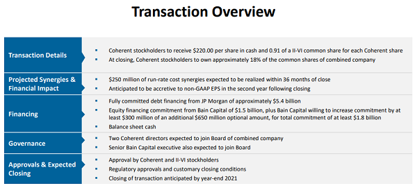 ICC訊(編譯:Nina)美國賓州匹茲堡,2021年3月25日--全球領(lǐng)先的工程材料和光電器件供應(yīng)商II-VI Corporated(納斯達(dá)克:IIVI)今天宣布,它與全球領(lǐng)先的激光器、基于激光的技術(shù)和基于激光的系統(tǒng)解決方案供應(yīng)商之一Coherent,Inc.(納斯達(dá)克:COHR)達(dá)成最終協(xié)議。根據(jù)該協(xié)議,II-VI將以現(xiàn)金和股票交易方式收購所有Coherent股票。根據(jù)交易條款,Coherent股東將以每股Coherent普通股交換為220美元的現(xiàn)金和0.91股II-VI普通股。