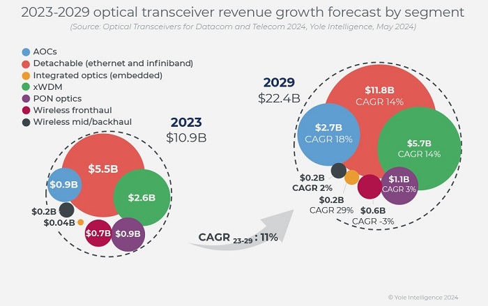 2023年,全球光收發(fā)器市場(chǎng)的收入從2022年的110億美元略微下降到109億美元,但由于云服務(wù)運(yùn)營商和國家電信運(yùn)營商對(duì)400G以上高數(shù)據(jù)速率模塊的高需求,預(yù)計(jì)該市場(chǎng)到2029年將達(dá)到224億美元。由于英偉達(dá)的大量人工智能基礎(chǔ)設(shè)施訂單和數(shù)據(jù)中心網(wǎng)絡(luò)升級(jí)到800G,預(yù)計(jì)2024年的收入增長率將達(dá)到27%。
