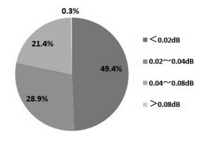 從OTDR雙向平均測(cè)試結(jié)果來(lái)看,同廠家熔接損耗最大值為0.08dB,如圖1所示,平均值為0.02dB,與G.652.D光纖熔接指標(biāo)相近。異廠家G.654熔接,平均損耗為0.044dB,樣本數(shù)60,比同廠家略大,可能由于MFD失配引起。G.654與G.652.D光纖間熔接損耗平均值為0.119dB,樣本數(shù)24個(gè)。