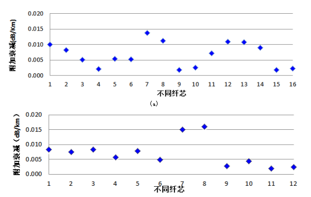 哈密-巴里坤架空光纜中有2個(gè)光纜段落,相比于光纜出廠測(cè)試結(jié)果,光纖鏈路的平均衰減系數(shù)增加量基本小于0.015dB/km,如圖2(a)所示,部分纖芯甚至小于0.01dB/km,即使包括了熔接損耗。濟(jì)南-青島管道光纜共有9個(gè)光纜段落,相應(yīng)的鏈路衰減系數(shù)平均值,增加量要在0.015dB/km左右,如圖2(b)所示,絕大部分纖芯均小于0.01dB/km。