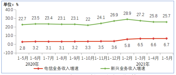 圖2 2020-2021年1-5月新興業(yè)務(wù)收入增長(zhǎng)情況