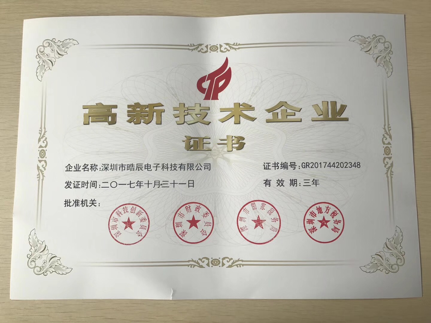 ICCSZ訊 日前,深圳市晧辰電子科技有限公司(簡稱“晧辰”)獲得深圳市科技創(chuàng)新委員會等頒發(fā)的“高新技術企業(yè)”認證,有效期三年,認證信息如下: