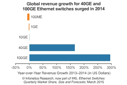 *2014年100GE端口增長了超過六倍,隨著成本的不斷下降,將會(huì)促使該市場2015年繼續(xù)快速發(fā)展。