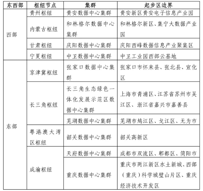 近日,國(guó)家發(fā)改委、中央網(wǎng)信辦、工信部、國(guó)家能源局四部門聯(lián)合發(fā)布復(fù)函,同意京津冀地區(qū)、長(zhǎng)三角地區(qū)、粵港澳大灣區(qū)、成渝地區(qū)啟動(dòng)建設(shè)全國(guó)一體化算力網(wǎng)絡(luò)國(guó)家樞紐節(jié)點(diǎn)。至此,八大樞紐節(jié)點(diǎn)均已完成批復(fù),各個(gè)樞紐節(jié)點(diǎn)集群起步區(qū)邊界明確(見(jiàn)下表)。起步區(qū)獲批建設(shè),是落實(shí)“東數(shù)西算”戰(zhàn)略的重要起步。