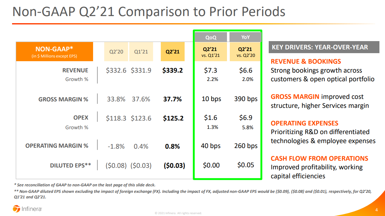 2021年第二季度,Infinera非 GAAP銷售收入3.39億美元,上個(gè)季度3.32億美元,去年同期3.33億美元。非GAAP毛利率37.7%,上個(gè)季度37.6%,去年同期33.8%。非GAAP凈虧損600萬美元,或每股虧損3美分;上個(gè)季度非GAAP凈虧損550萬美元,或每股虧損3美分;去年同期非GAAP凈虧損1560萬美元,或每股虧損8美分。