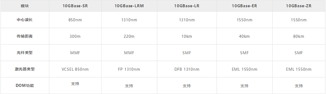 10G SFP+系列光模塊包括:SR、LRM、LR、ER、ZR、BIDI、CWDM、DWDM等,通用LC接口,完全符合IEEE802.3ae、SFF-8472和SFF-8431質(zhì)量標(biāo)準(zhǔn);針對以下5種10G SFP+光模塊,為了能讓大家能夠更清晰地區(qū)分,下表中對比了這幾種光模塊的參數(shù)。