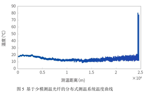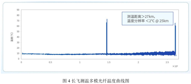 性能優(yōu)化后的測溫多模光纖結(jié)合長飛DTS主機(jī)測試結(jié)果顯示,溫度曲線平整,測溫距離在25km時,溫度分辨率優(yōu)于2℃,空間分辨率約2-3米。另外,此光纖還做了抗彎和耐高溫涂層處理,使該光纖更適合成纜以及高溫應(yīng)用。