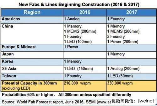 以晶圓尺寸來(lái)看,那19座晶圓廠(生產(chǎn)線)中有12座是12寸(300mm)、4座是8寸(200mm),還有3座是LED廠,分別是6寸(150mm)、4寸(100mm)與2寸(50mm)。不包括LED廠在內(nèi),新晶圓廠(生產(chǎn)線)的安裝產(chǎn)能,估計(jì)在2016年開(kāi)始興建的可達(dá)到每月12萬(wàn)片初始晶圓(12寸約當(dāng)),2017年開(kāi)始興建的則可達(dá)到每月33萬(wàn)片初始晶圓(12寸約當(dāng))。