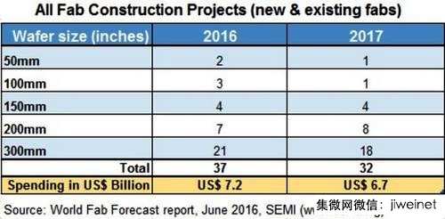 下表是SEMI列出的所有2016與2017年新晶圓廠(依尺寸)興建計(jì)畫(huà)──包括尚未動(dòng)工以及進(jìn)行中的;估計(jì)總支出金額達(dá)到139億美元。