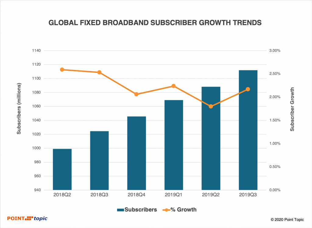 全球固定寬帶Q319增長2.17%達(dá)11.12億