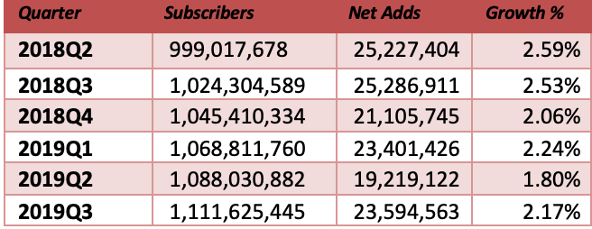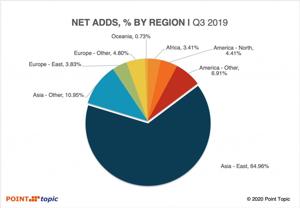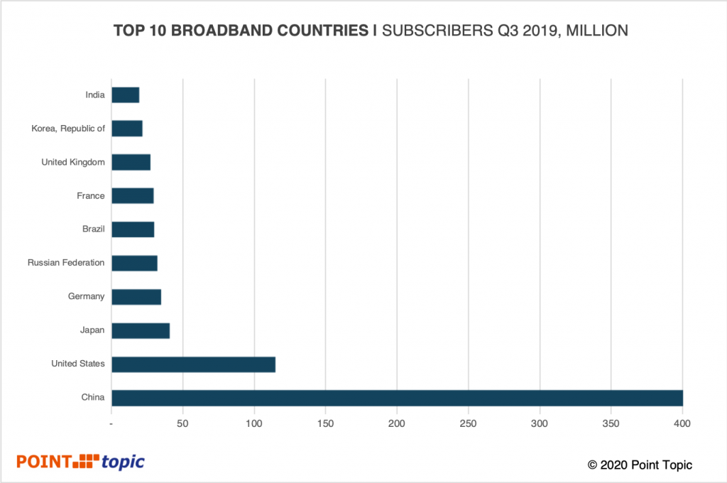中國仍然是最大的光纖增長市場,2019年第三季度占全球FTTH凈增長的69.6%(凈增長1500萬)。