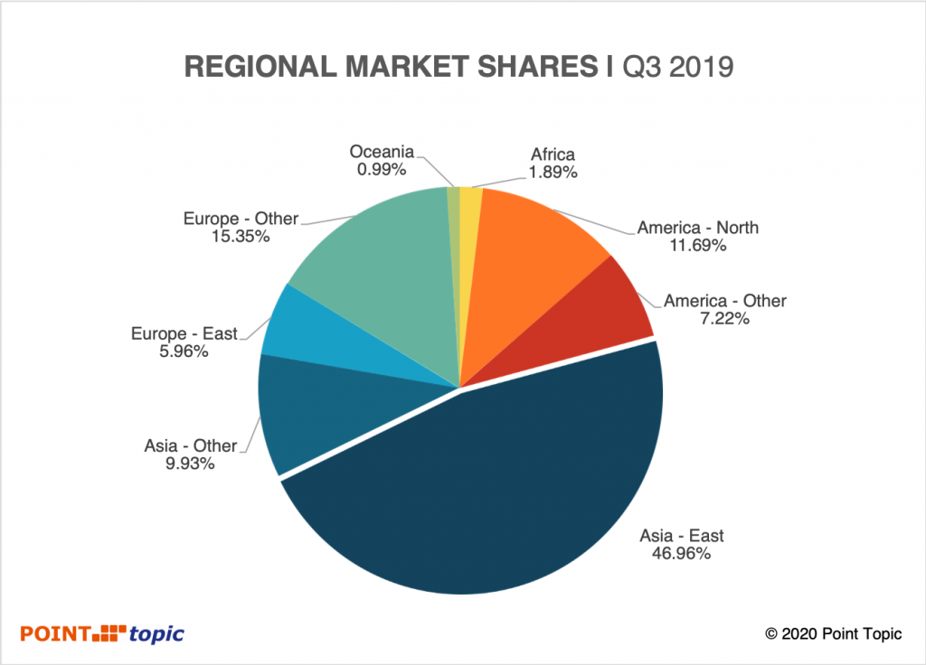 固定寬帶用戶凈增量的近65%來自東亞(圖3),東亞也保持了所有用戶最大的區(qū)域市場份額,為47%(圖4)。 與2019年第二季度相比,大多數(shù)地區(qū)的市場份額變化不到一個百分點(diǎn)。