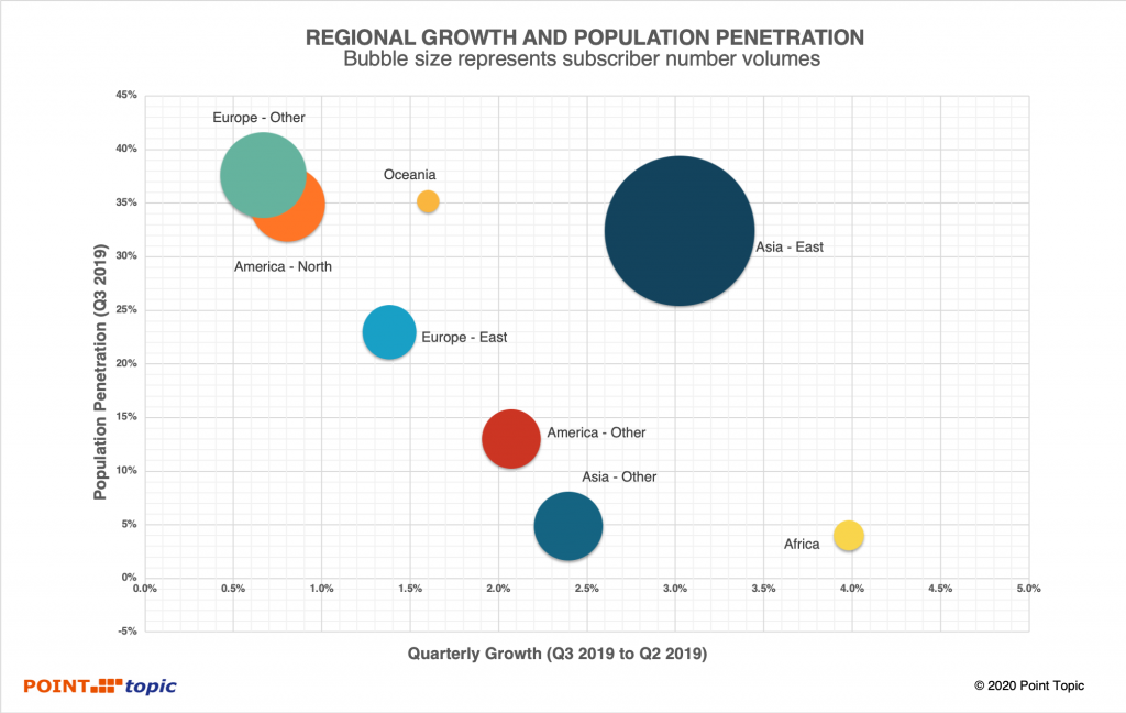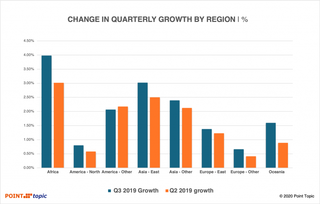 2019年第三季度,東亞的固定寬帶用戶增長排名第二,季度增長3%,中國是主要推動力,季度增長3.42%。 亞太地區(qū)緊隨其后,本季度增長了2.4%,這是由于沙特阿拉伯增長了6.7%,尼泊爾增長了6.2%,印度尼西亞增長了5.6%,菲律賓增長了3.8%和越南增長了3.6%的緣故。 總體而言,寬帶滲透率較低的國家/地區(qū)的增長趨向于更高,但某些市場除外,其中由于固定線路的滲透率較低而導(dǎo)致移動寬帶占主導(dǎo)(圖7)。