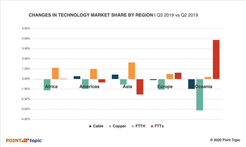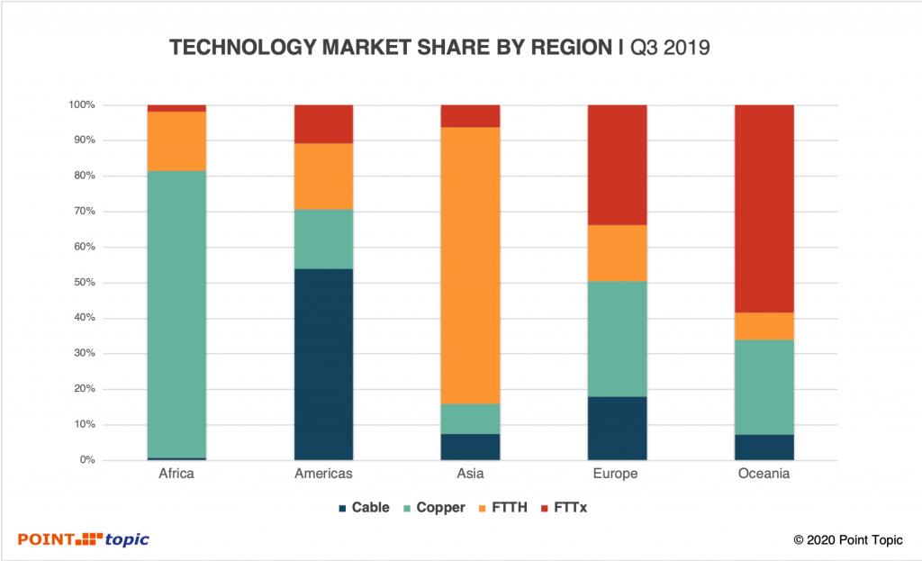 就年度變化而言,在2018年第三季度至2019年第三季度之間,全球銅線數(shù)量下降了7.7%,而FTTH連接數(shù)量增長了18.5%,FTTx增長了2.5%(圖11)。 用戶放棄銅纜而傾向于光纖的趨勢仍在繼續(xù)。 無線技術(shù)(主要是FWA)和衛(wèi)星技術(shù)被越來越多地用于覆蓋寬帶白點(diǎn),使得其健康發(fā)展。