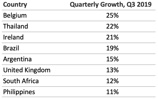 比利時,泰國,愛爾蘭和巴西等國家的FTTH季度增長率都很高,分別為25%,22%,21%和19%。