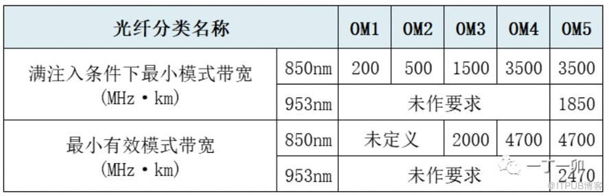 多模光纖的模式帶寬與信道的波長相關(guān),OM1、OM2、OM3、OM4和OM5光纖在850nm和953nm的最小模式帶寬見下表。