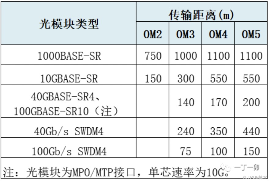 多模光纖的最大傳輸距離主要與光纖的模式帶寬和光模塊類型有關(guān),不同速率光模塊的最大傳輸距離見下表(表中OM3、OM4在SWDM下的傳輸距離來自飛速FS,其它傳輸距離來自長飛官網(wǎng))。